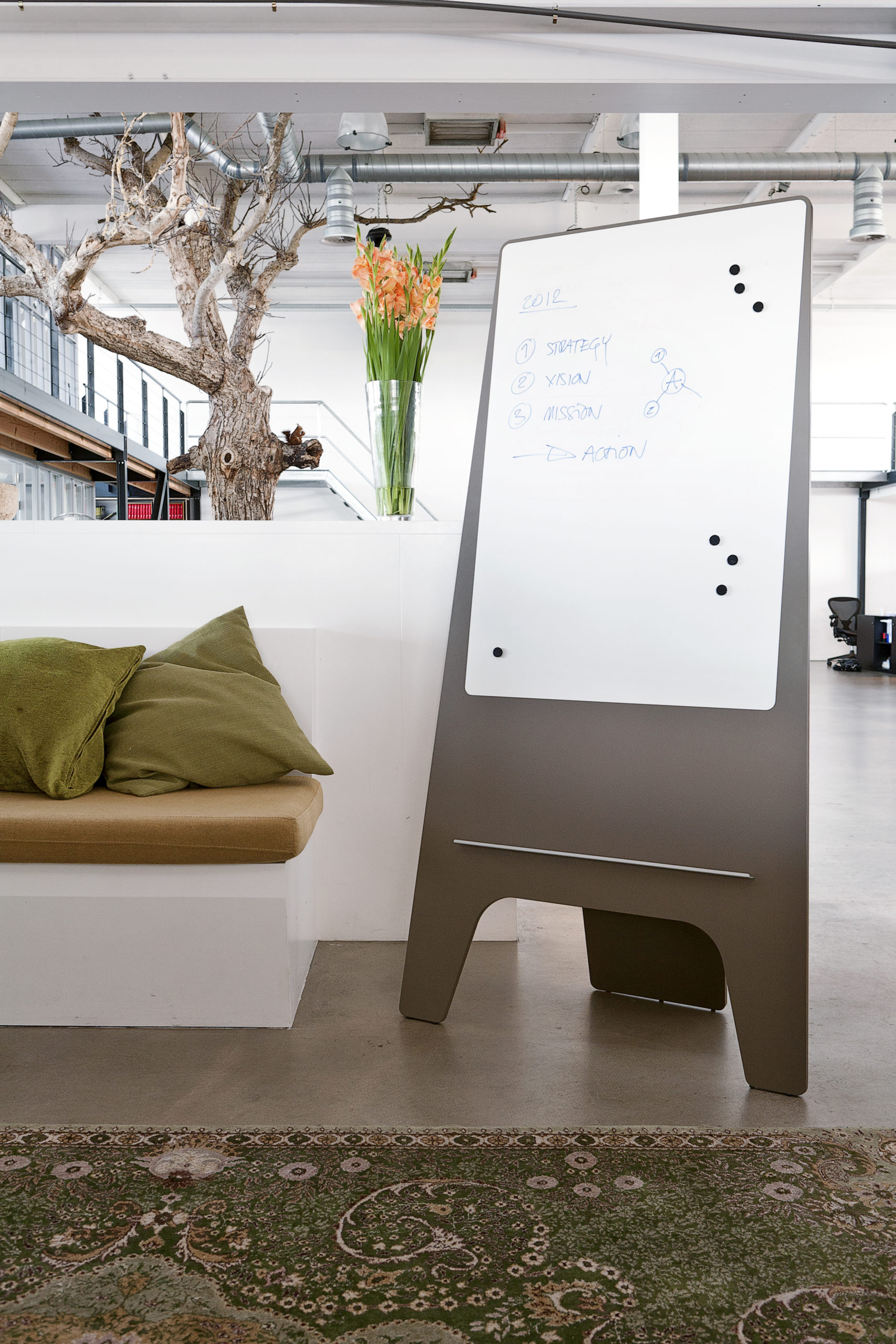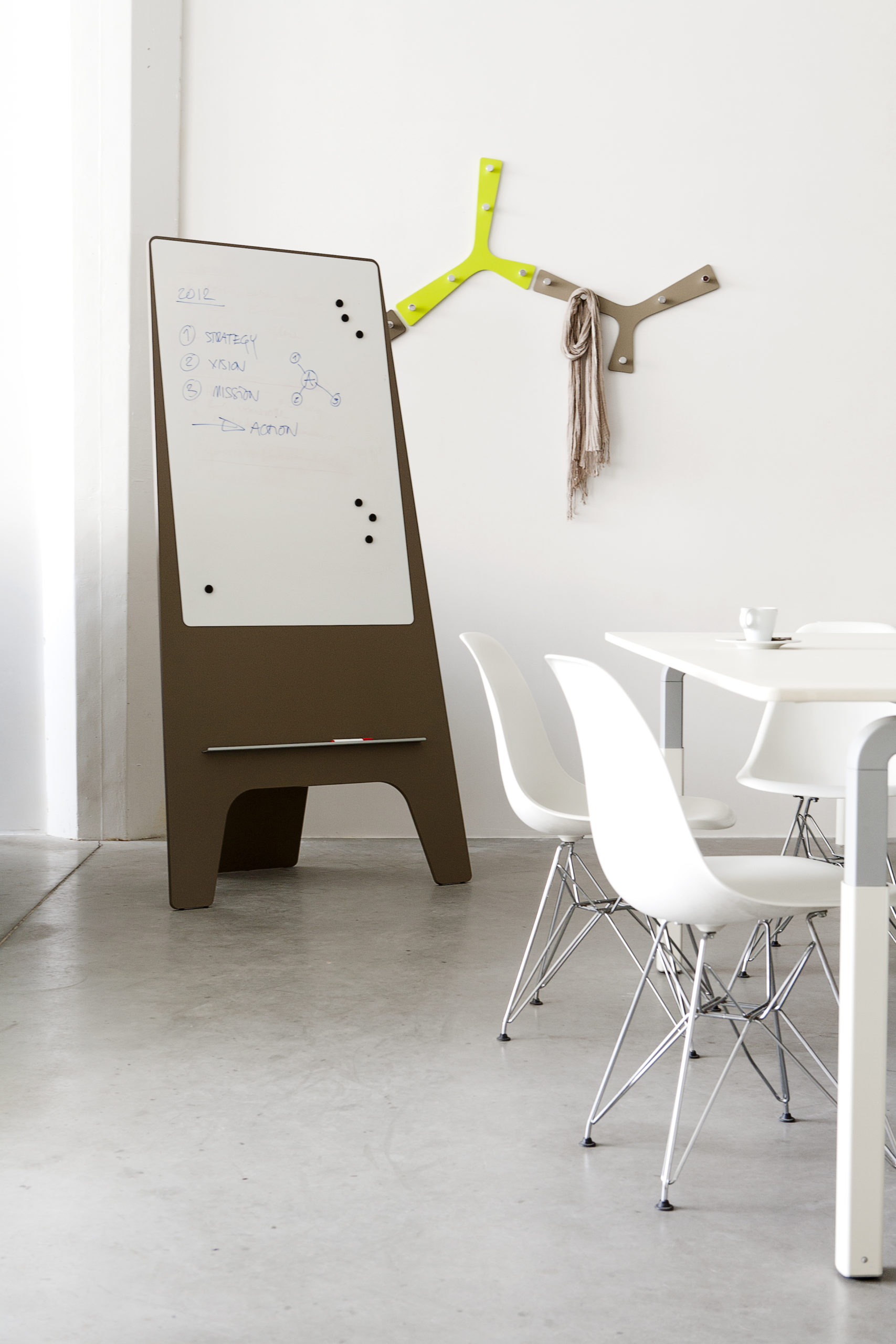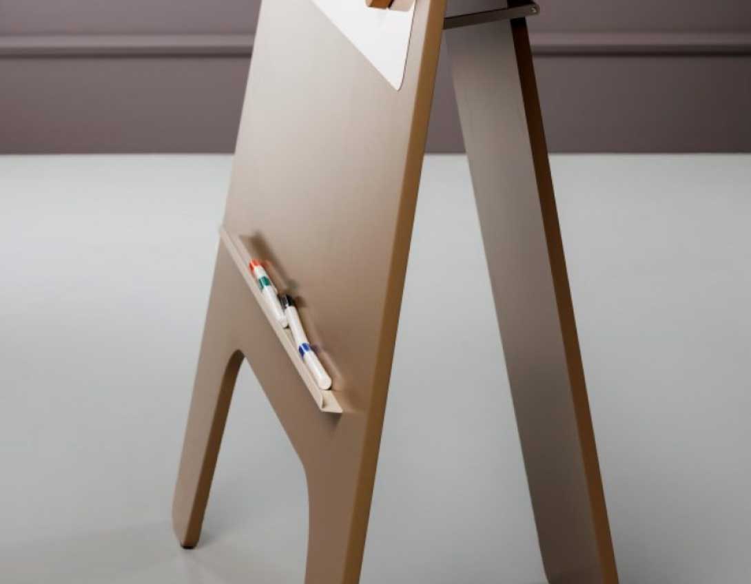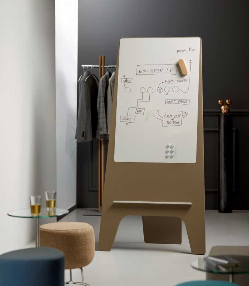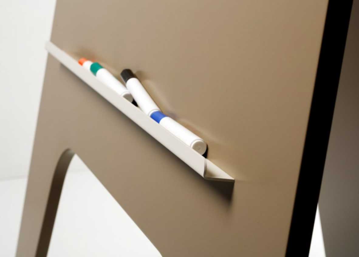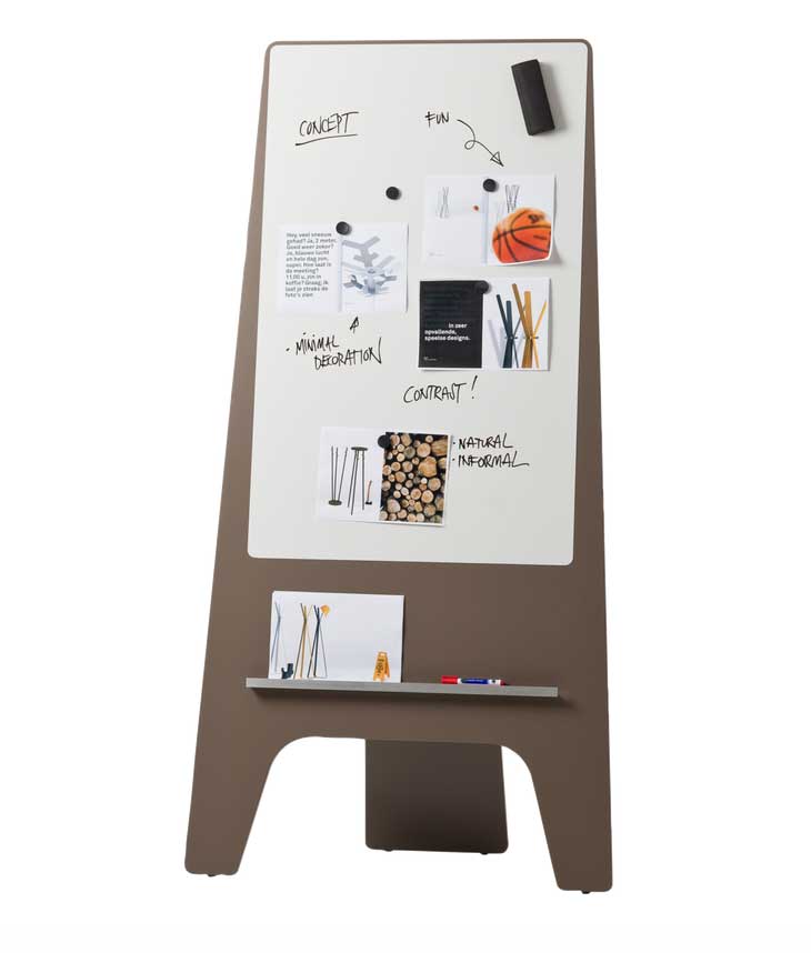 Un support en aluminium permet d’accueillir feutres et petites feuilles. Ce paperboard sur pied conçu par le designer Robert Bronwasser deviendra vite un élément indispensable de vos bureaux et salles de réunion.