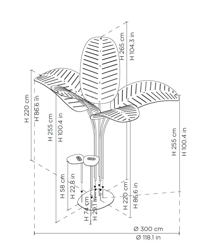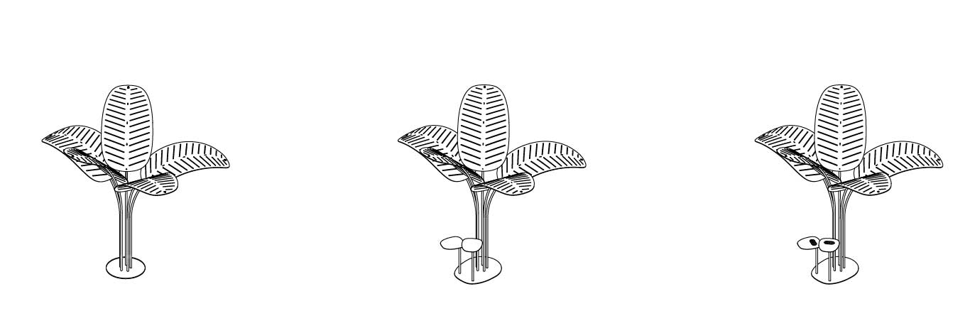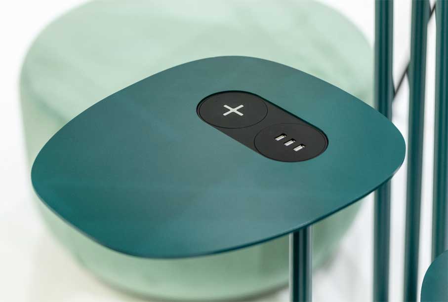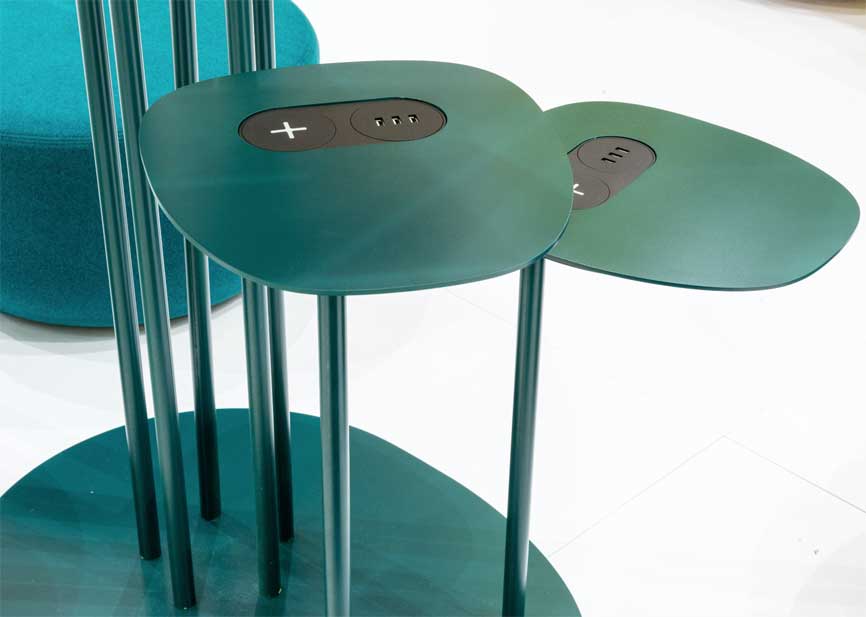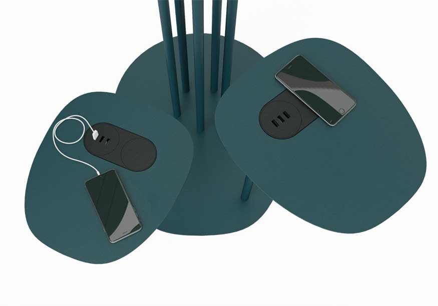 La structure et le piètement sont réalisés en métal laqué. Disponible en 3 versions, à savoir la version simple avec tiges et feuilles, la version avec 2 table basse intégrées et la version avec tables basses et chargeurs pour appareils électroniques.